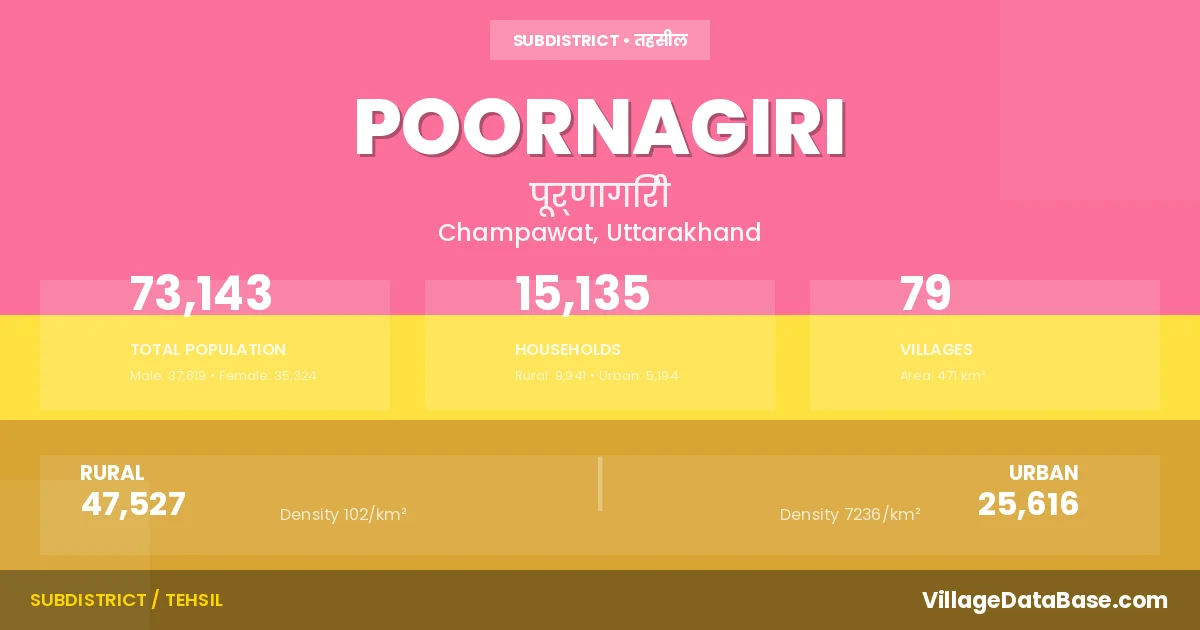 According to the 2011 census The total area of Poornagiri Tehsil is 471 km², with a population of 73143 people. The population density is 155 inhabitants per square kilometre, and there are approximately 15135 houses in the sub district.