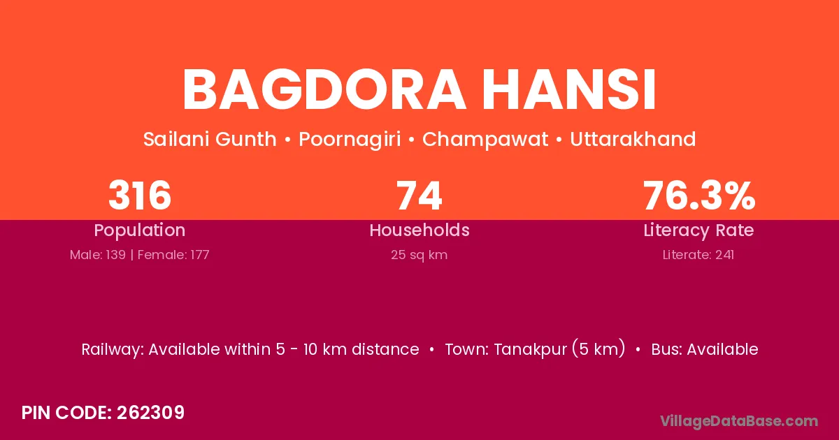 Tanakpur (5 km) is the nearest town to Bagdora Hansi village for major economic activities and is located approximately 5 km away.