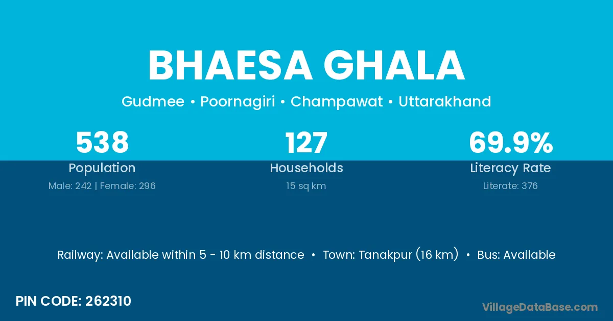 Tanakpur (16 km) is the nearest town to Bhaesa Ghala village for major economic activities and is located approximately 16 km away.