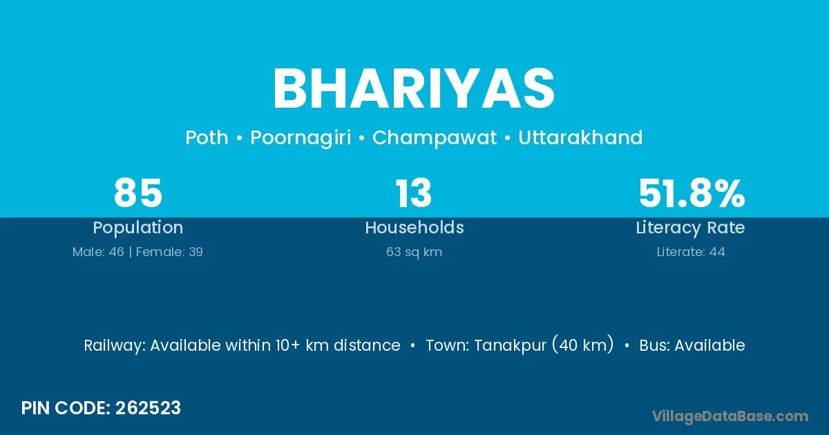Tanakpur (40 km) is the nearest town to Bhariyas village for major economic activities and is located approximately 40 km away.
