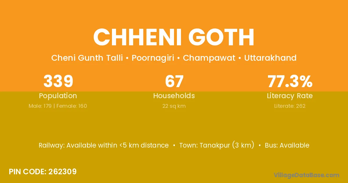 Tanakpur (3 km) is the nearest town to Chheni Goth village for major economic activities and is located approximately 3 km away.