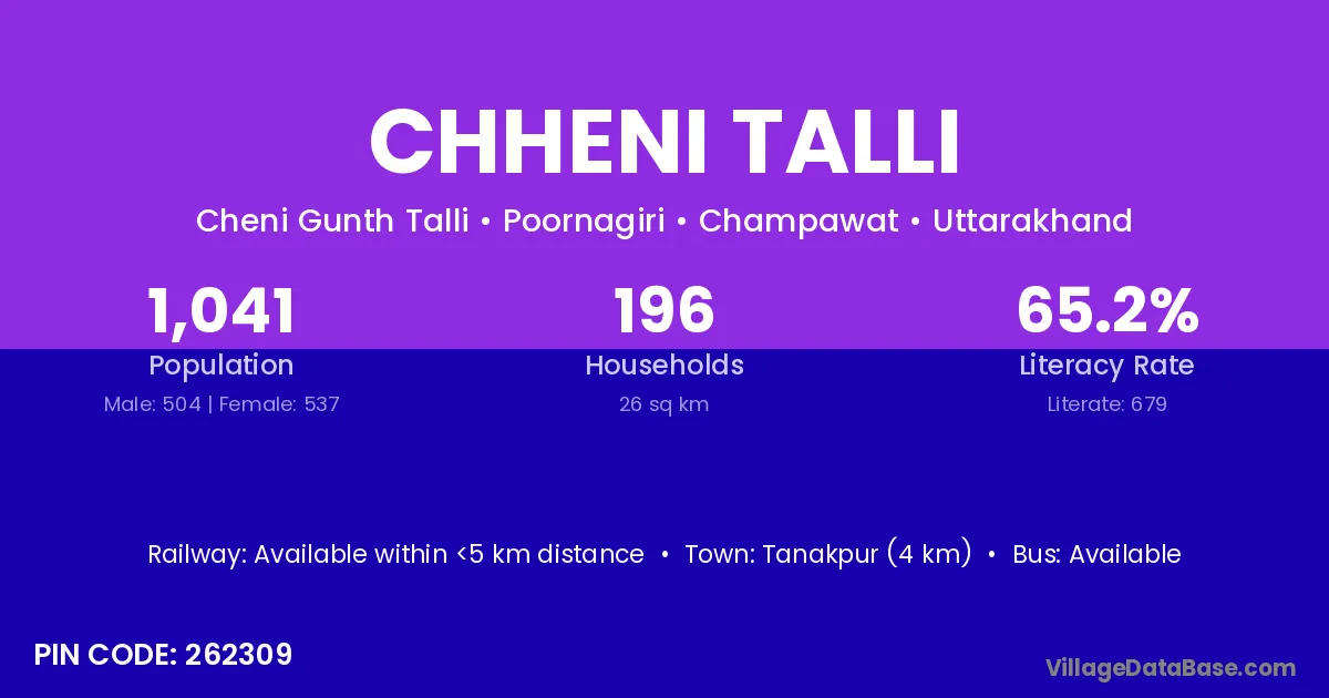 Tanakpur (4 km) is the nearest town to Chheni Talli village for major economic activities and is located approximately 4 km away.