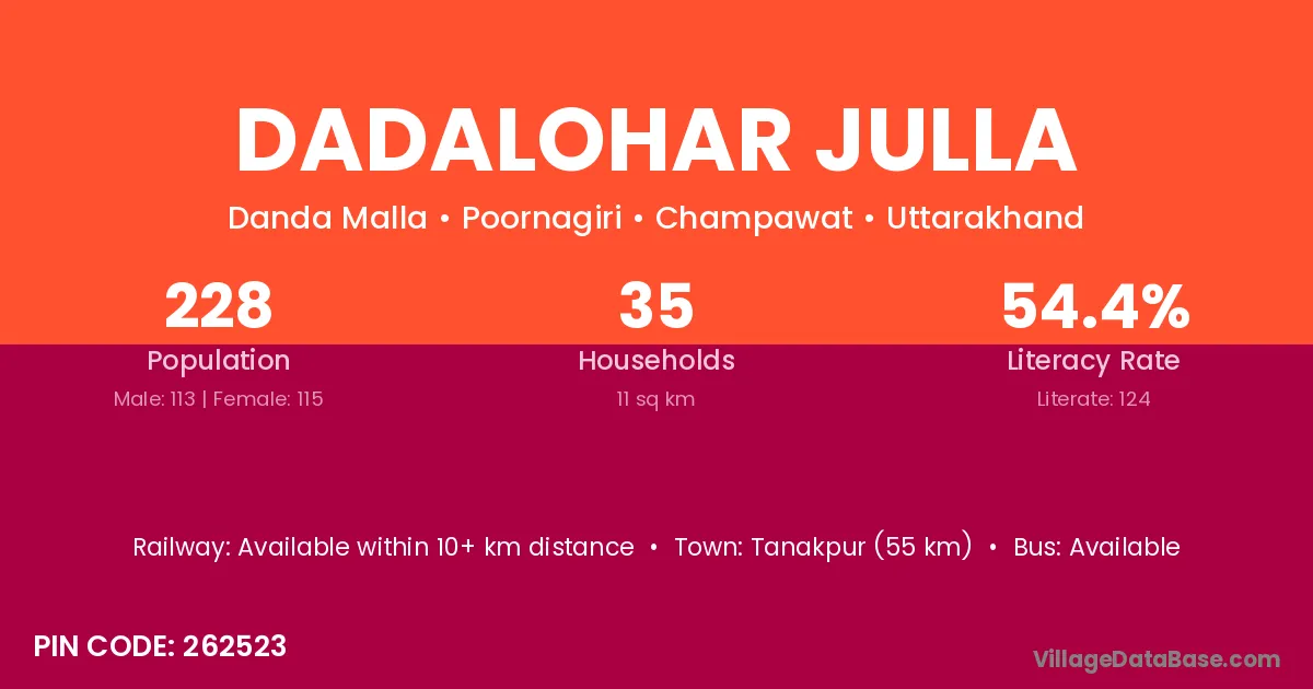 Tanakpur (55 km) is the nearest town to Dadalohar Julla village for major economic activities and is located approximately 55 km away.