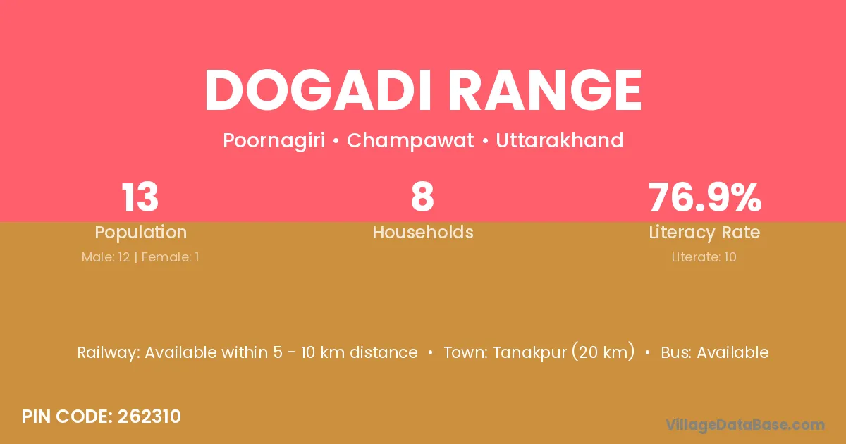 Dogadi Range village has a total population of 13 people, of which 12 are males and 1 are females.