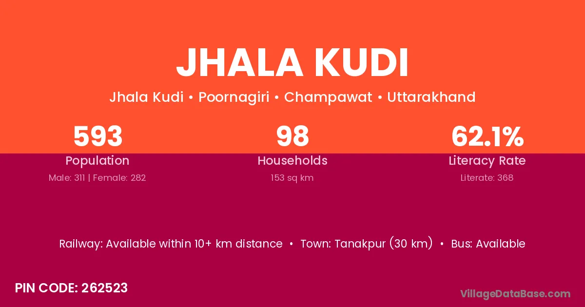 Jhala Kudi village has a total population of 593 people, of which 311 are males and 282 are females.