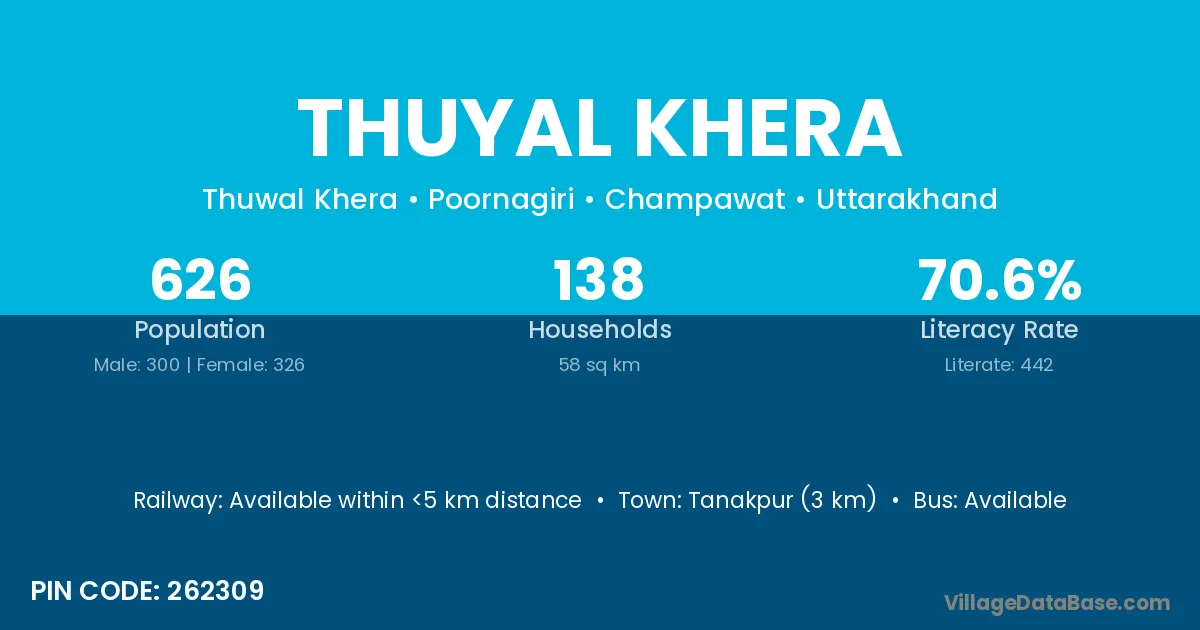 Tanakpur (3 km) is the nearest town to Thuyal Khera village for major economic activities and is located approximately 3 km away.