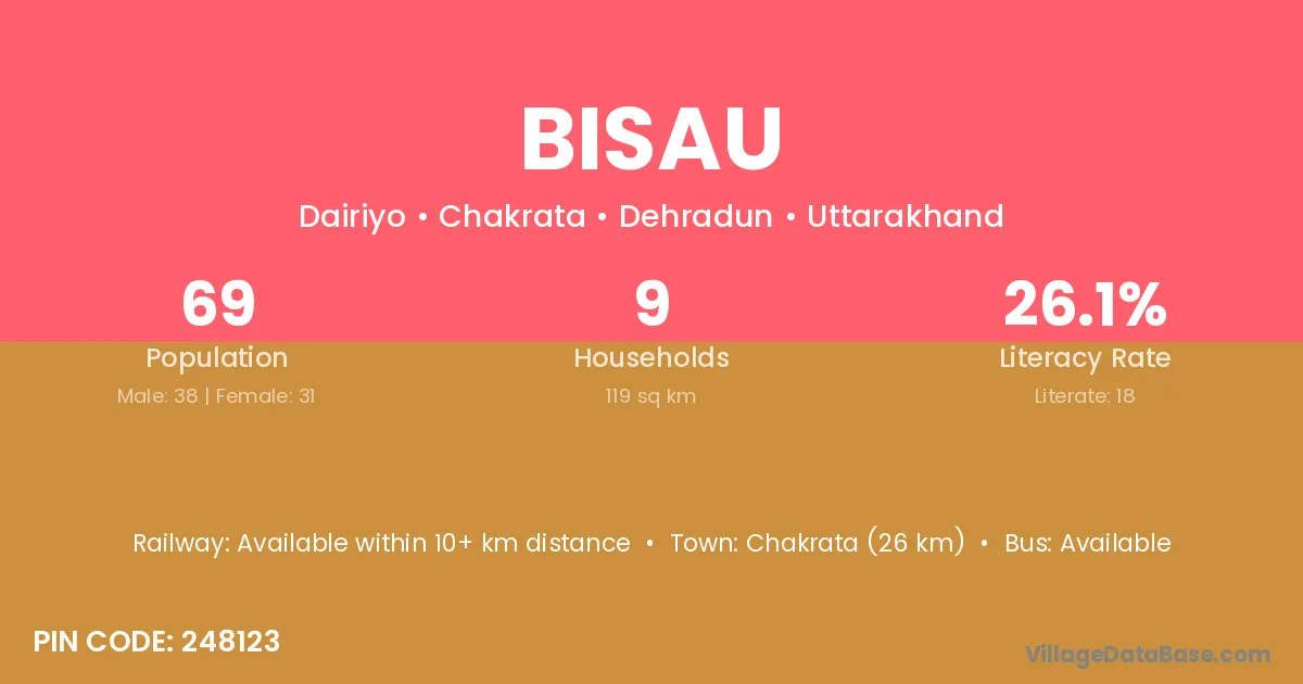 Chakrata (26 km) is the nearest town to Bisau village for major economic activities and is located approximately 26 km away.