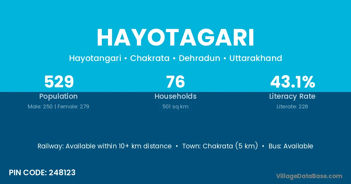 Chakrata (5 km) is the nearest town to Hayotagari village for major economic activities and is located approximately 5 km away.