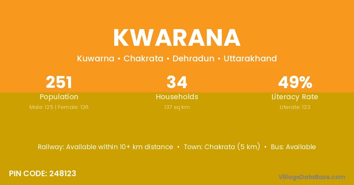 Chakrata (5 km) is the nearest town to Kwarana village for major economic activities and is located approximately 5 km away.