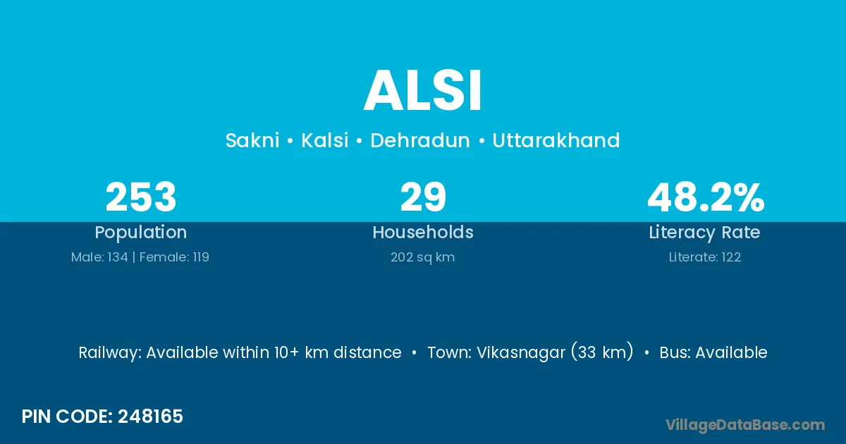 Vikasnagar (33 km) is the nearest town to Alsi village for major economic activities and is located approximately 33 km away.