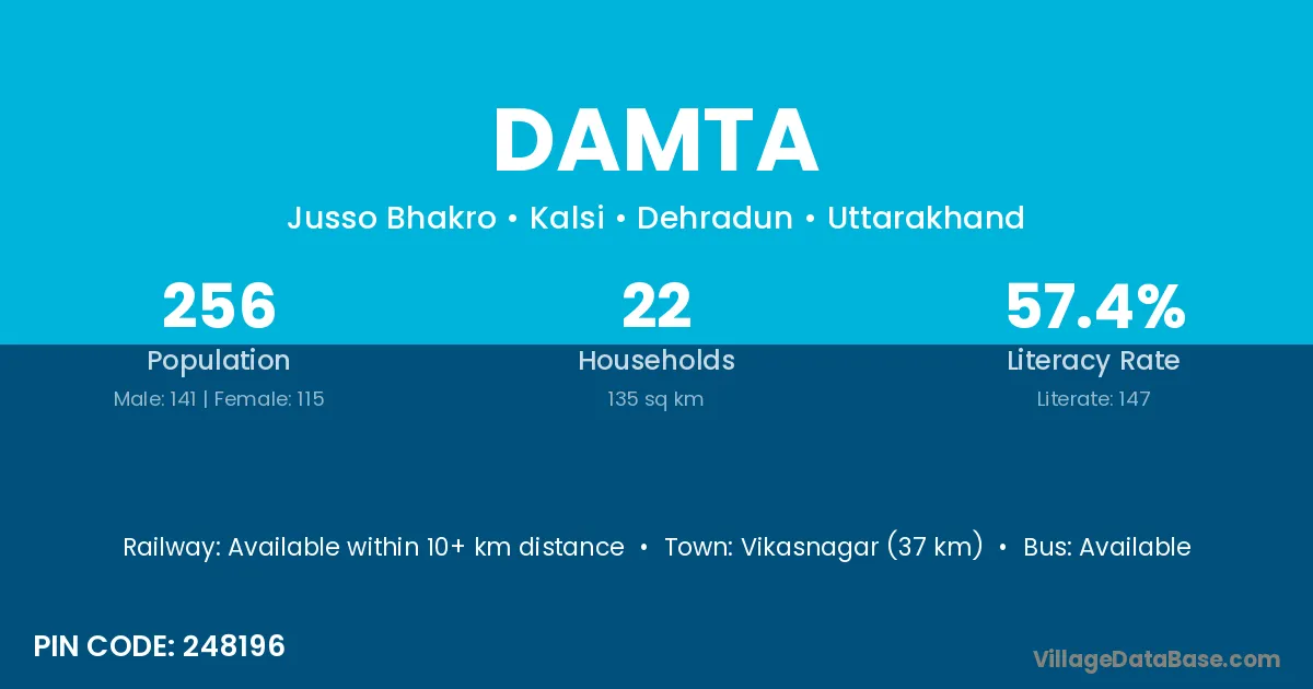 Vikasnagar (37 km) is the nearest town to Damta village for major economic activities and is located approximately 37 km away.