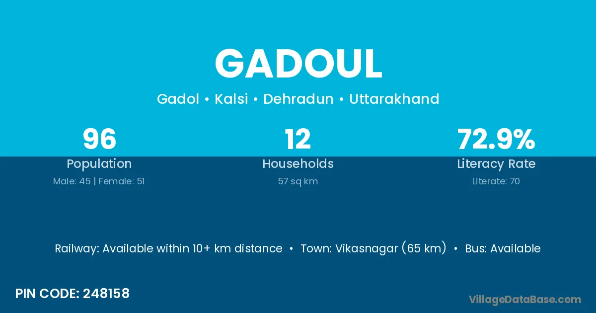 Vikasnagar (65 km) is the nearest town to Gadoul village for major economic activities and is located approximately 65 km away.