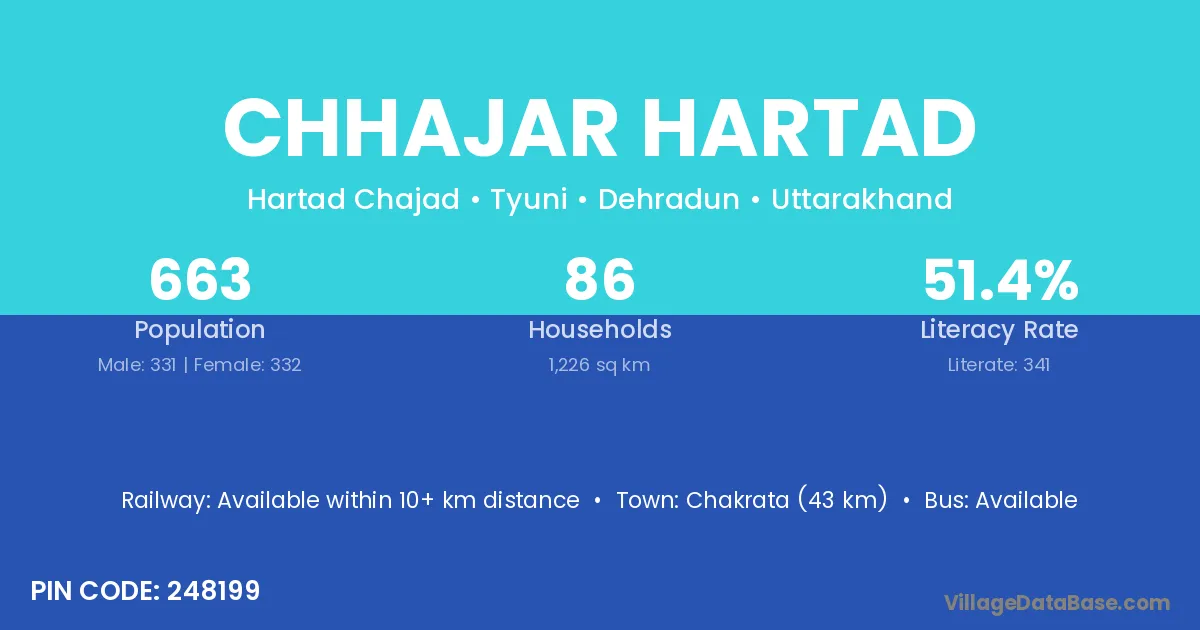 Chakrata (43 km) is the nearest town to Chhajar Hartad village for major economic activities and is located approximately 43 km away.
