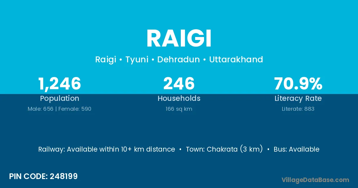 Chakrata (3 km) is the nearest town to Raigi village for major economic activities and is located approximately 3 km away.
