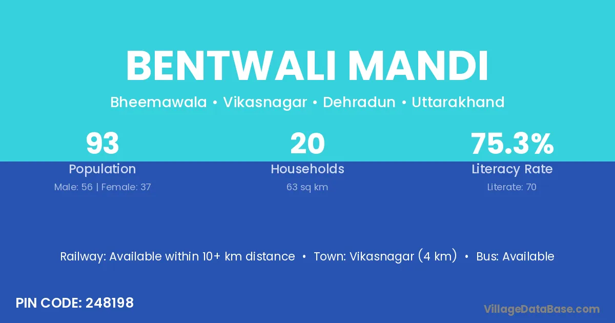 Vikasnagar (4 km) is the nearest town to Bentwali Mandi village for major economic activities and is located approximately 4 km away.
