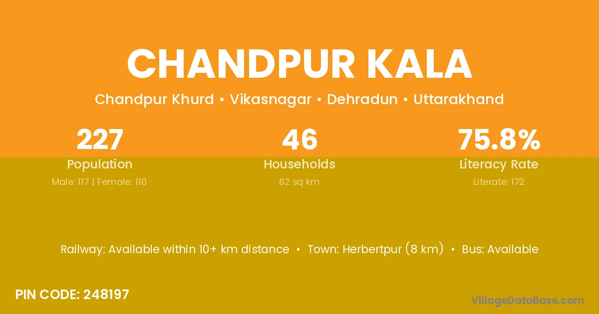 Herbertpur (8 km) is the nearest town to Chandpur Kala village for major economic activities and is located approximately 8 km away.