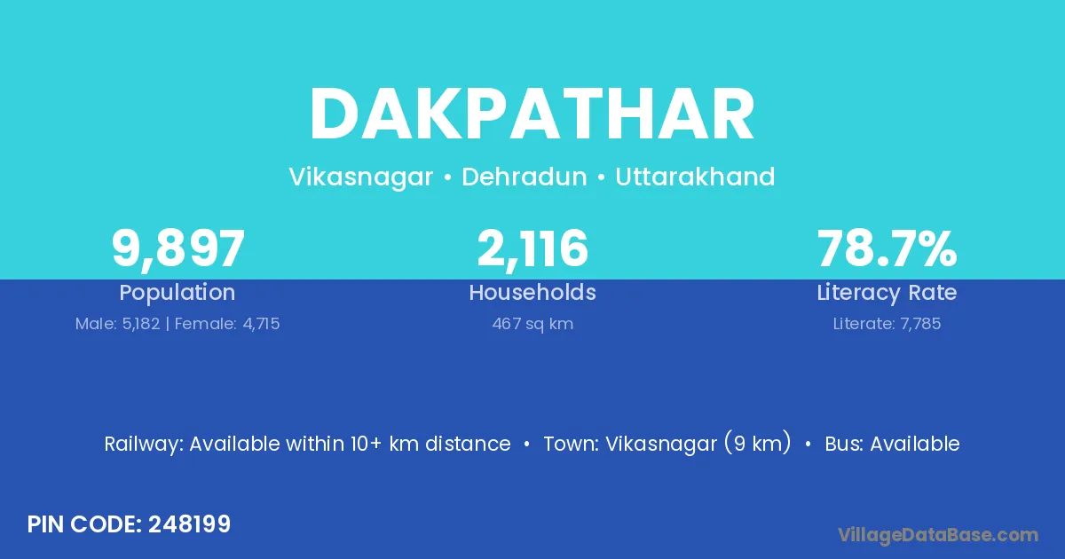 Vikasnagar (9 km) is the nearest town to Dakpathar village for major economic activities and is located approximately 9 km away.