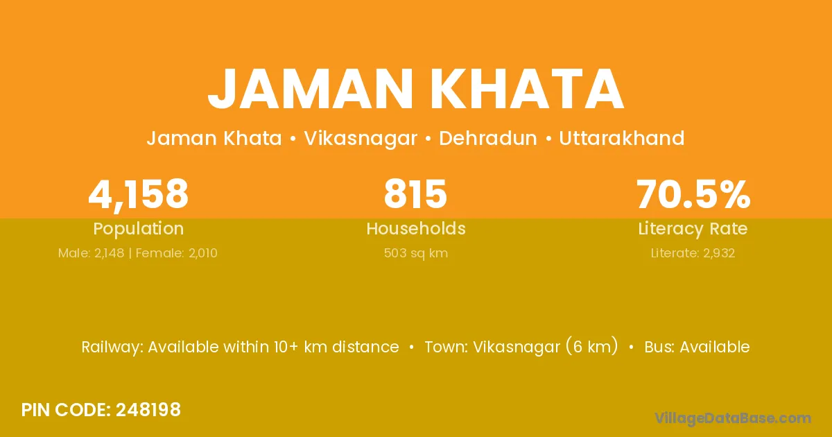 Vikasnagar (6 km) is the nearest town to Jaman Khata village for major economic activities and is located approximately 6 km away.