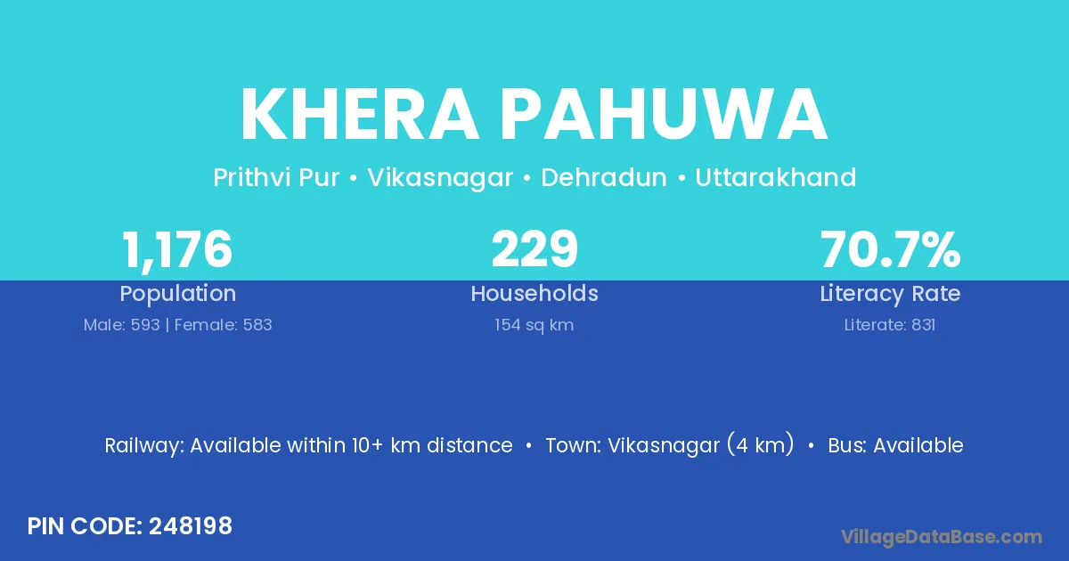 Vikasnagar (4 km) is the nearest town to Khera Pahuwa village for major economic activities and is located approximately 4 km away.