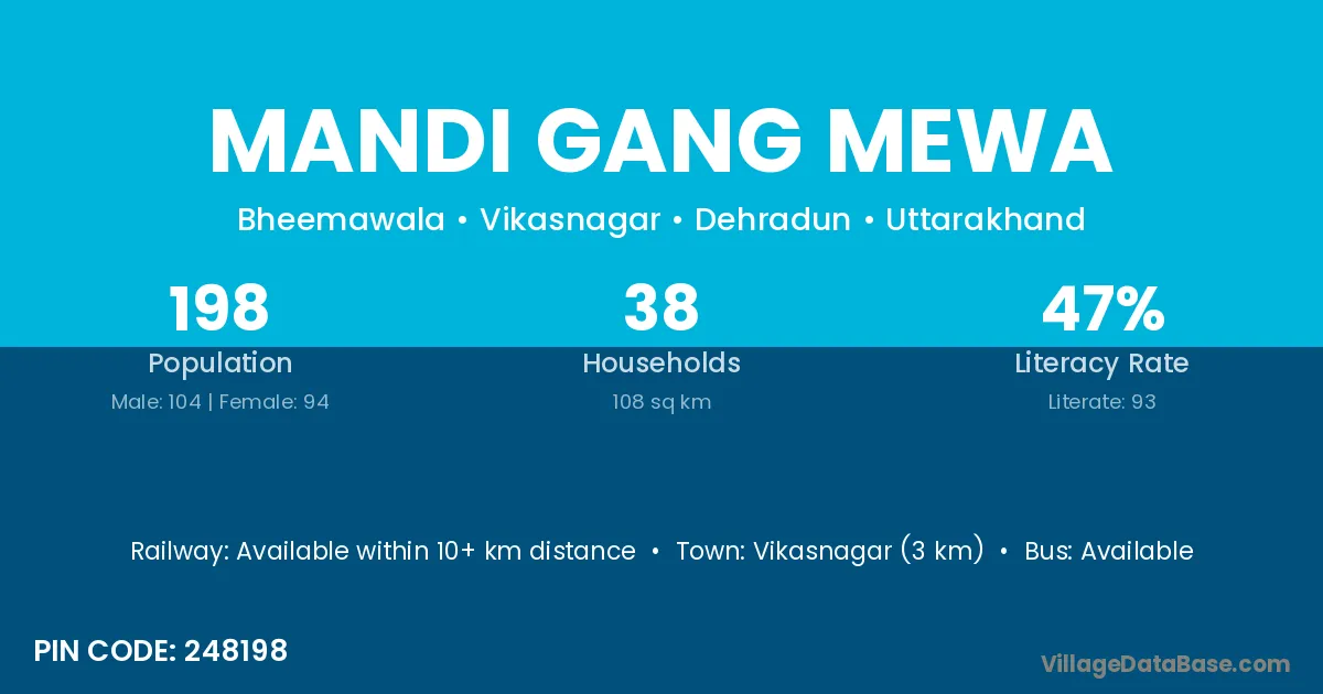 Mandi Gang Mewa village has a total population of 198 people, of which 104 are males and 94 are females.