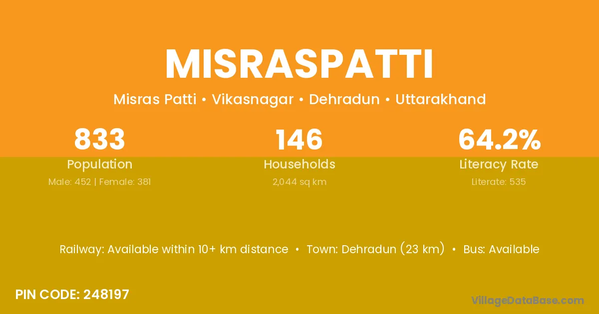 Dehradun (23 km) is the nearest town to Misraspatti village for major economic activities and is located approximately 23 km away.
