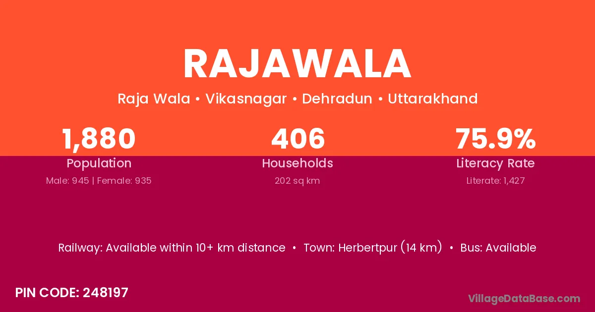 Herbertpur (14 km) is the nearest town to Rajawala village for major economic activities and is located approximately 14 km away.