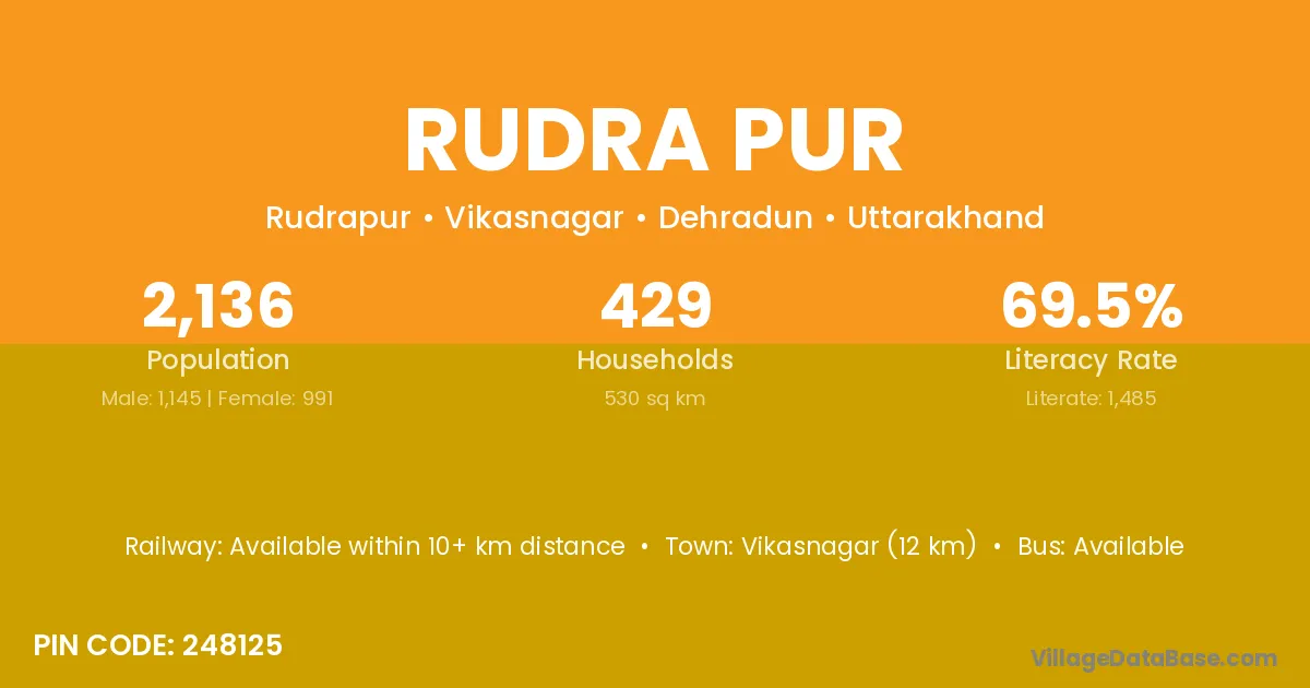 Rudra Pur village has a total population of 2,136 people, of which 1,145 are males and 991 are females.