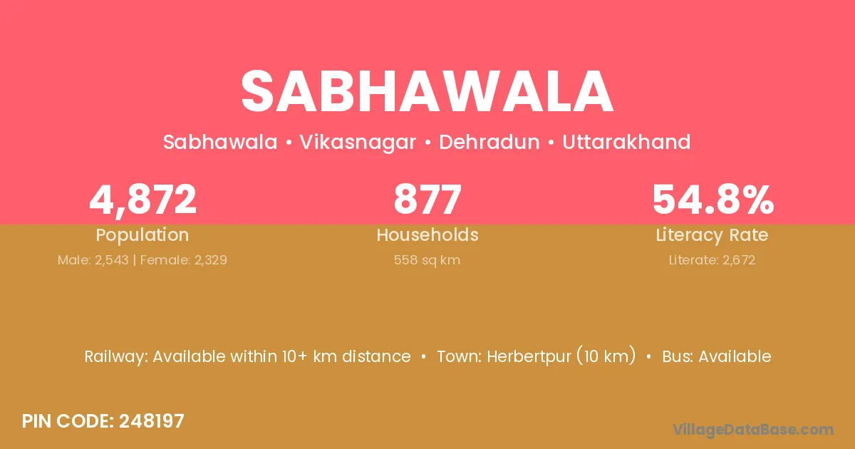 Sabhawala village has a total population of 4,872 people, of which 2,543 are males and 2,329 are females.