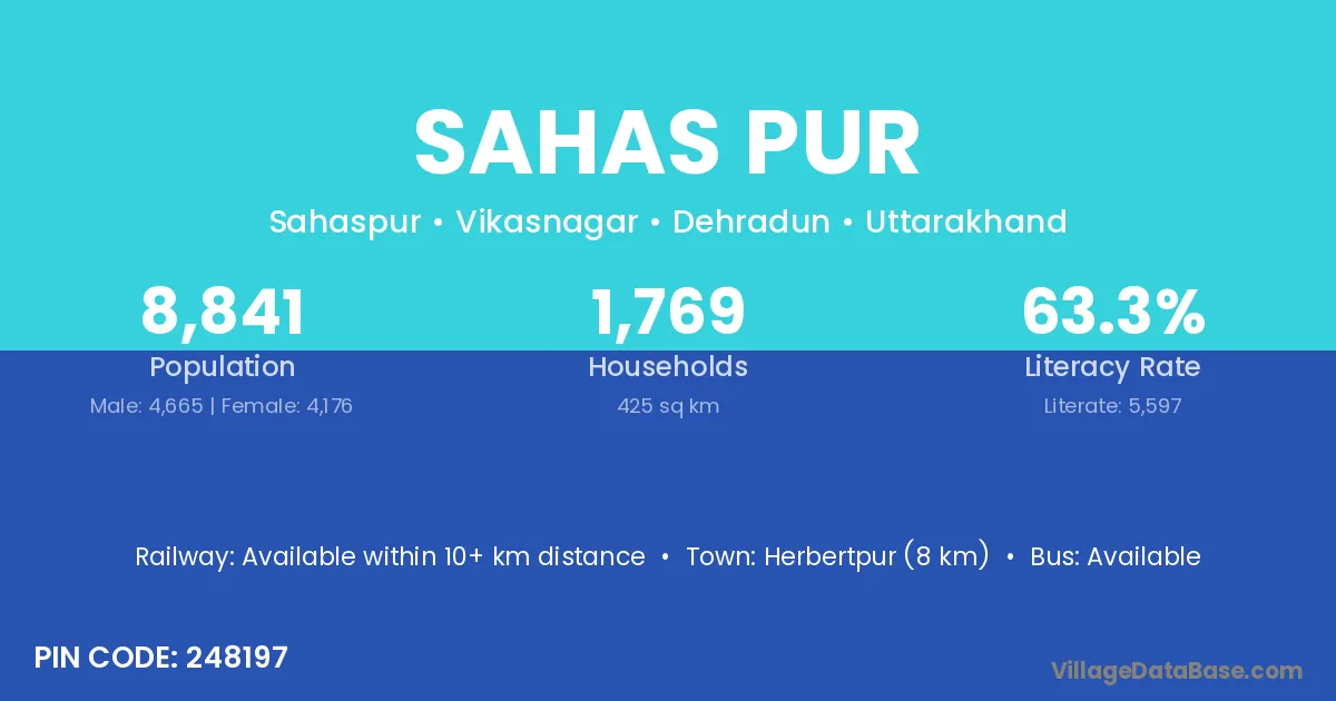 Herbertpur (8 km) is the nearest town to Sahas Pur village for major economic activities and is located approximately 8 km away.