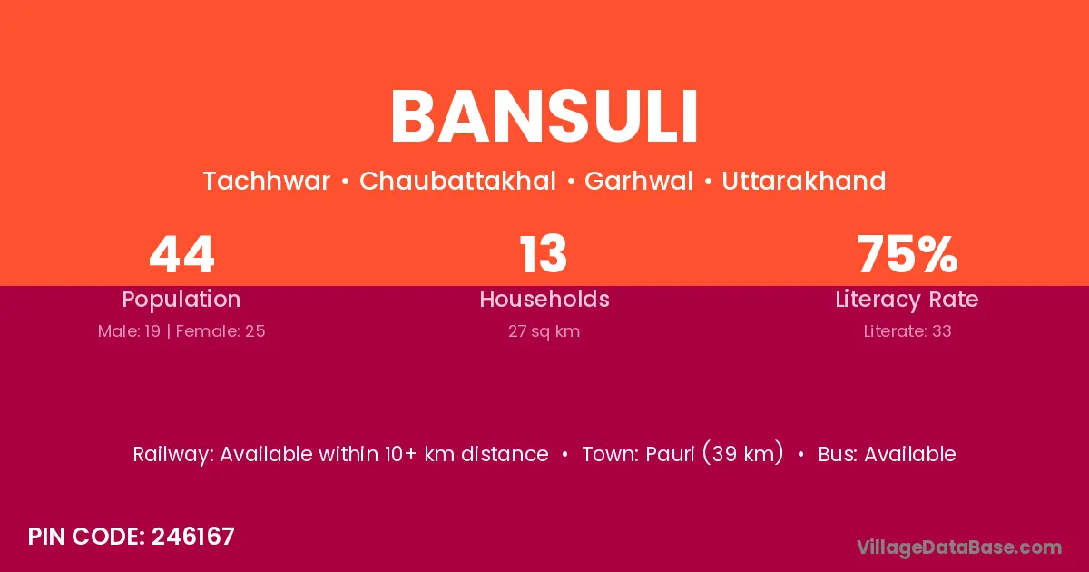 Pauri (39 km) is the nearest town to Bansuli village for major economic activities and is located approximately 39 km away.