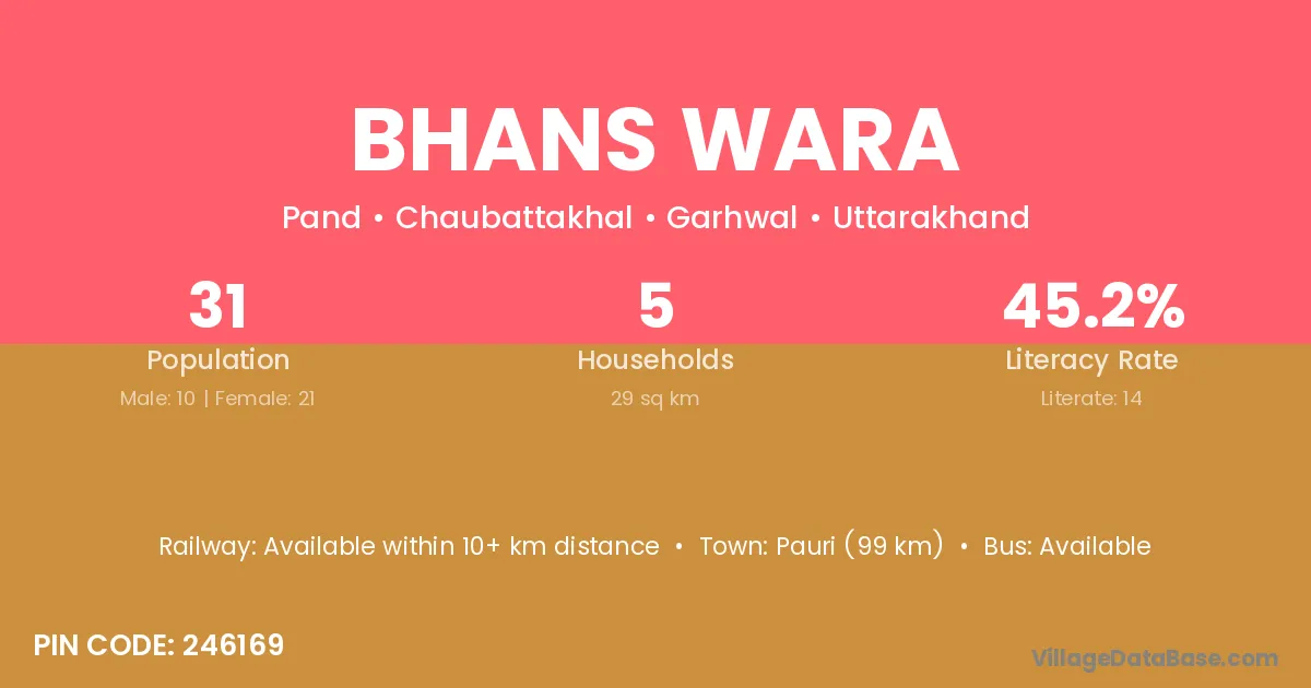 Pauri (99 km) is the nearest town to Bhans Wara village for major economic activities and is located approximately 99 km away.