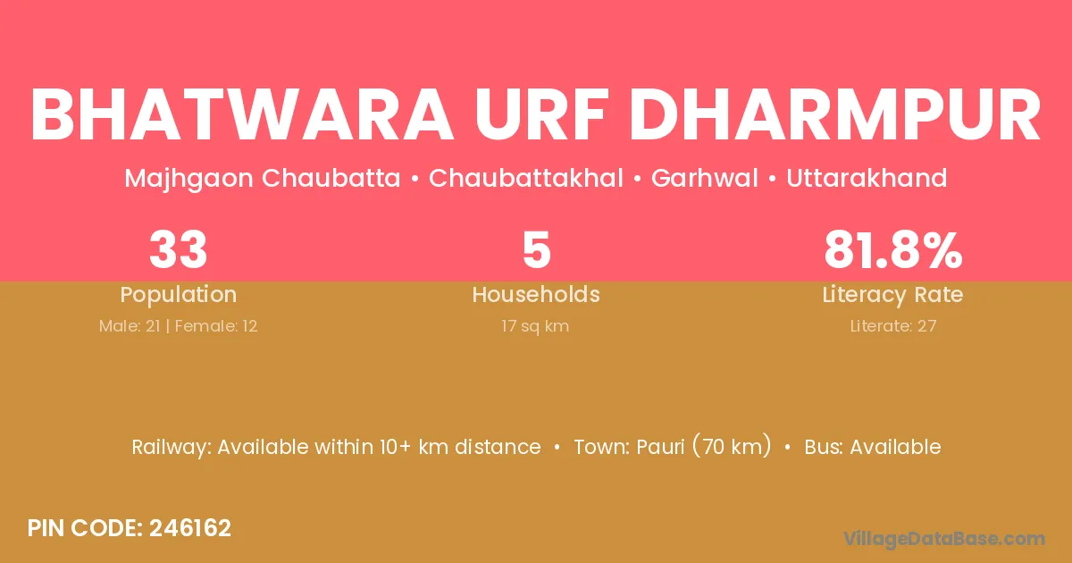 Bhatwara Urf Dharmpur village has a total population of 33 people, of which 21 are males and 12 are females.