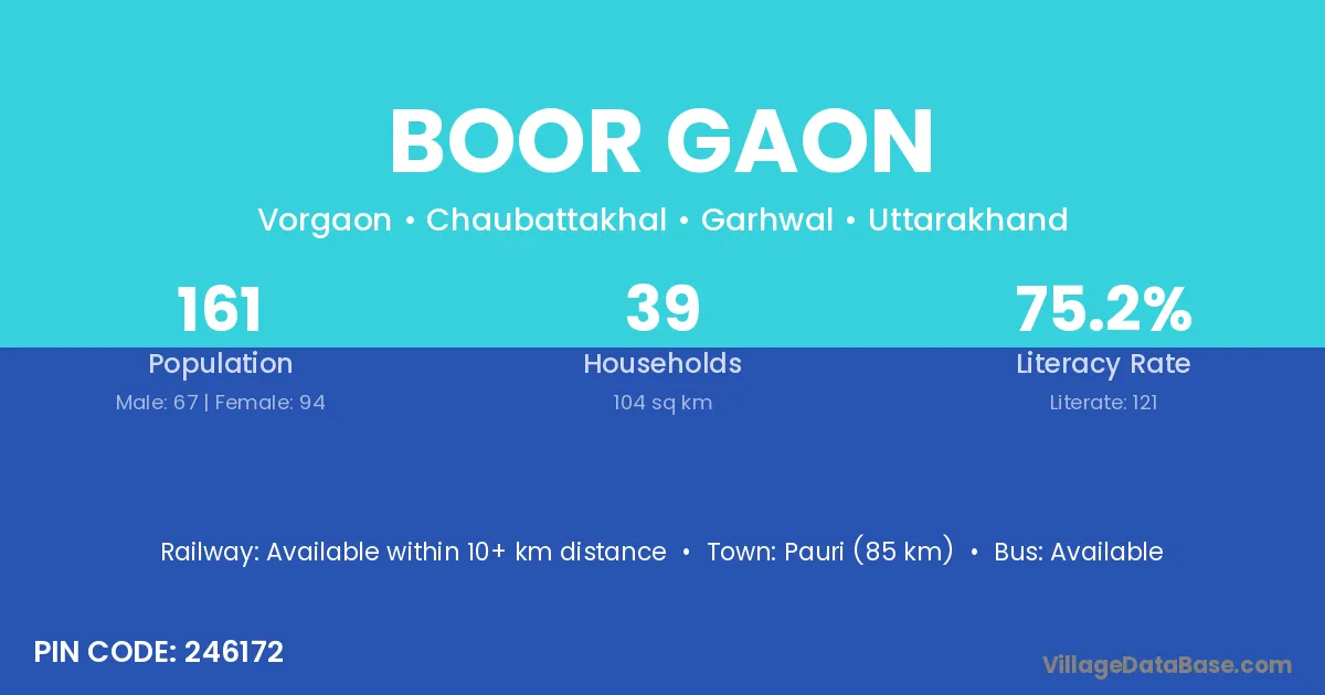 Pauri (85 km) is the nearest town to Boor Gaon village for major economic activities and is located approximately 85 km away.