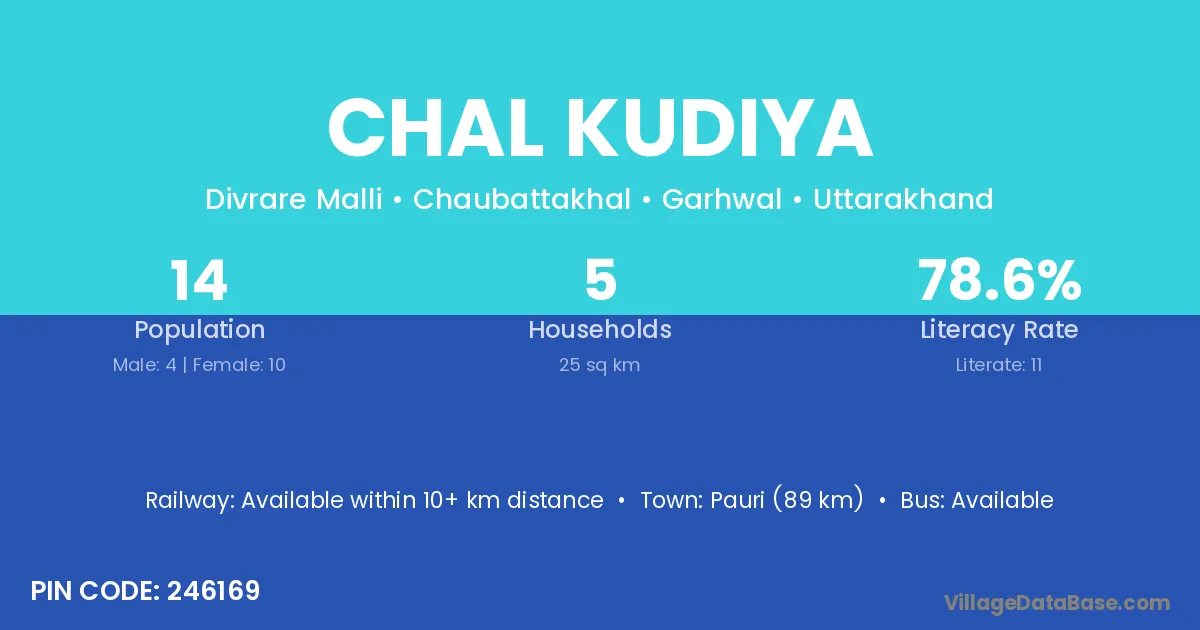 Pauri (89 km) is the nearest town to Chal Kudiya village for major economic activities and is located approximately 89 km away.