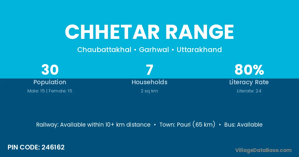 Chhetar Range village has a total population of 30 people, of which 15 are males and 15 are females.