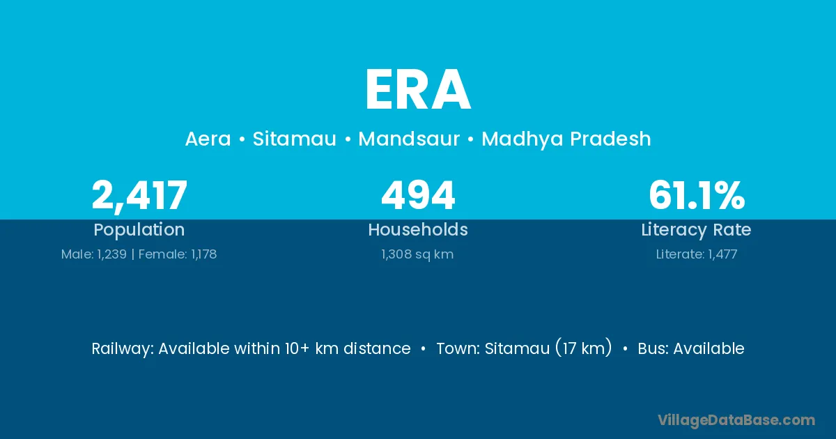 The literacy rate of Era village is 75.57%. Male literacy stands at 85.00% and female literacy at 67.61%.