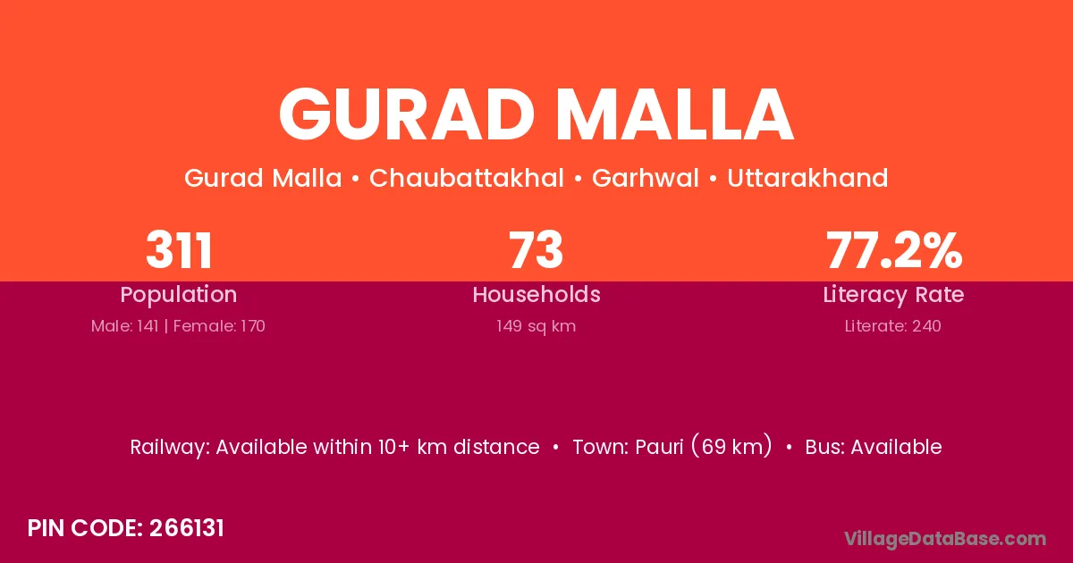 Pauri (69 km) is the nearest town to Gurad Malla village for major economic activities and is located approximately 69 km away.