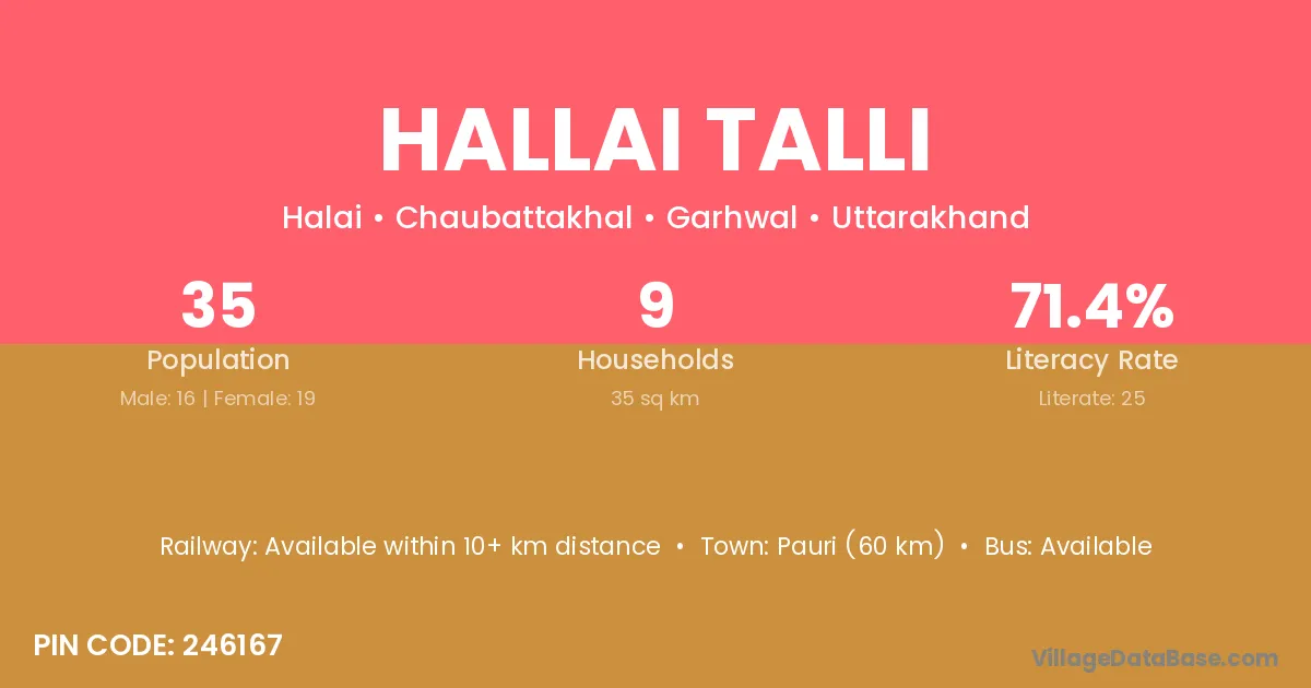 Pauri (60 km) is the nearest town to Hallai Talli village for major economic activities and is located approximately 60 km away.