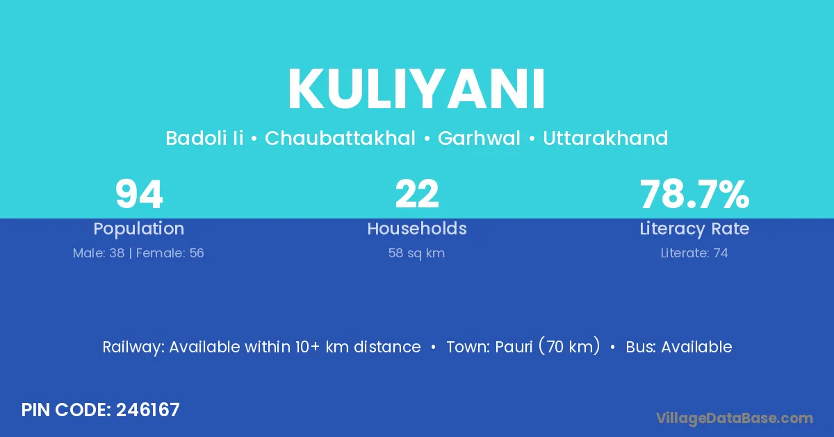 Pauri (70 km) is the nearest town to Kuliyani village for major economic activities and is located approximately 70 km away.