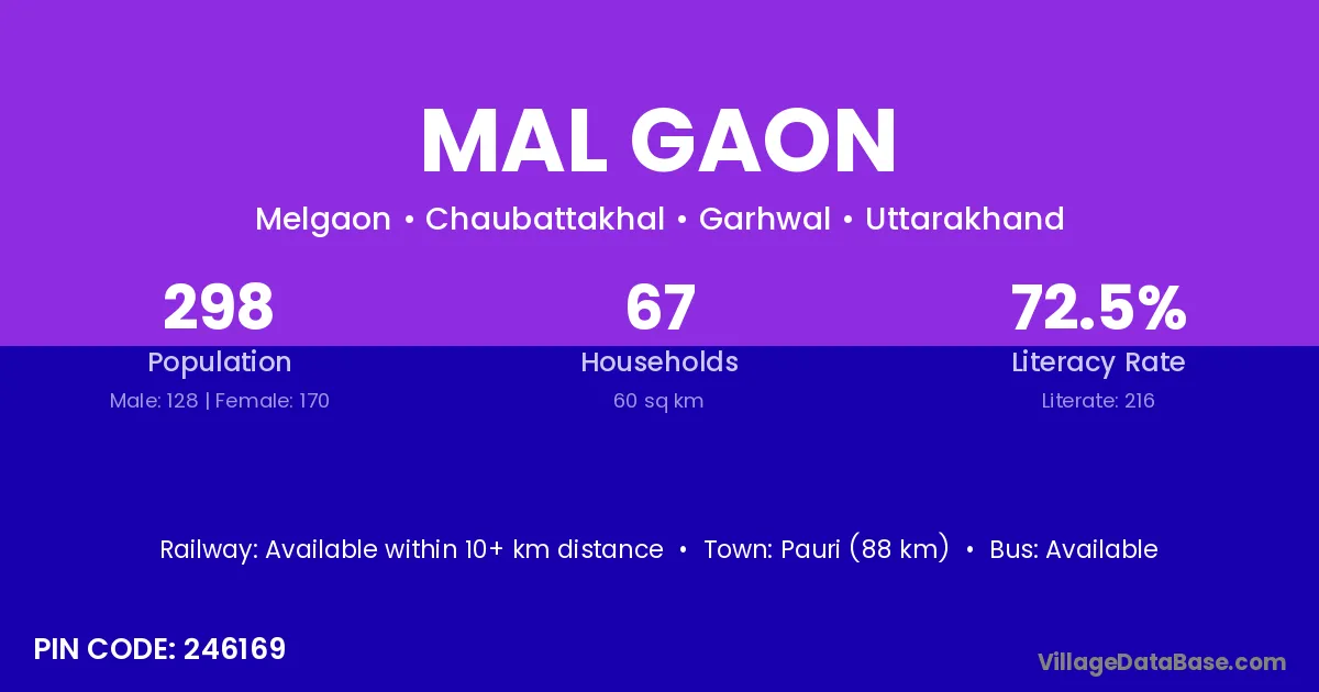 Pauri (88 km) is the nearest town to Mal Gaon village for major economic activities and is located approximately 88 km away.