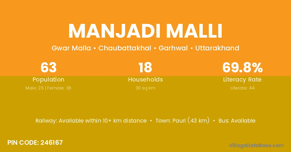 Pauri (43 km) is the nearest town to Manjadi Malli village for major economic activities and is located approximately 43 km away.
