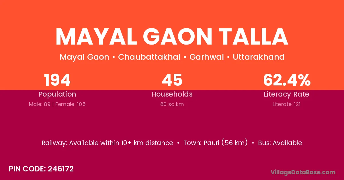 Pauri (56 km) is the nearest town to Mayal Gaon Talla village for major economic activities and is located approximately 56 km away.