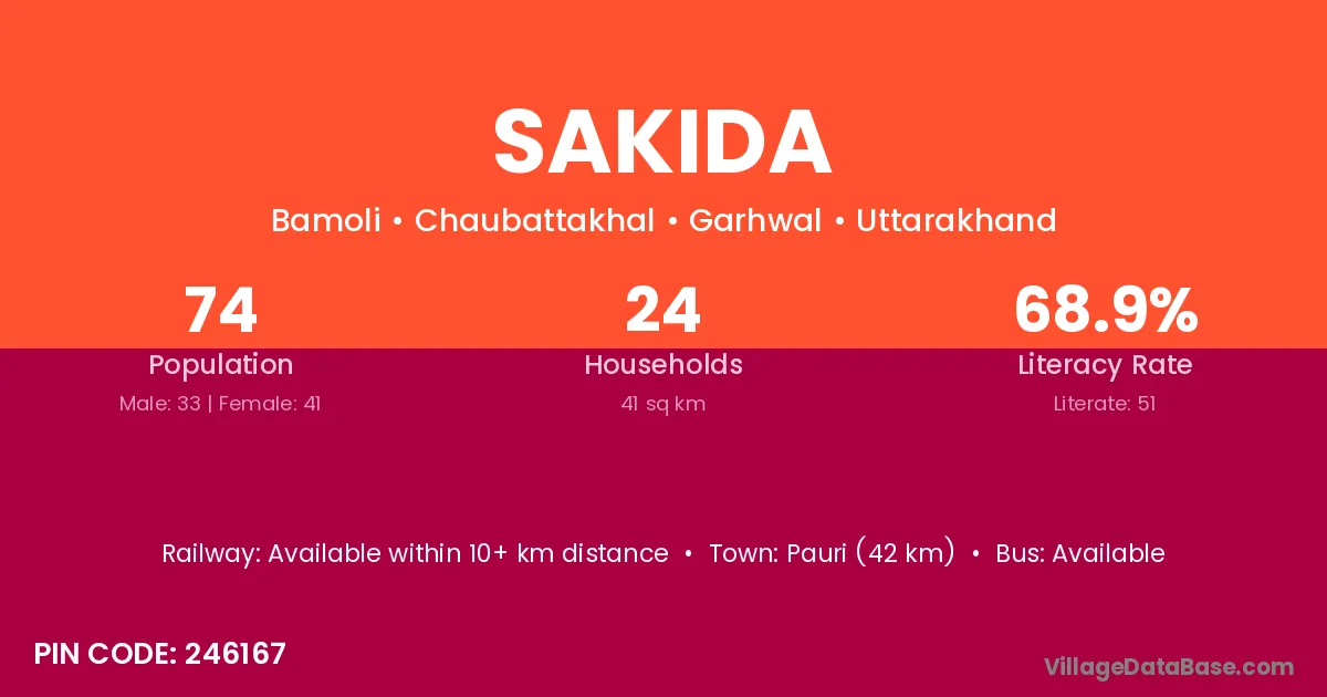 Pauri (42 km) is the nearest town to Sakida village for major economic activities and is located approximately 42 km away.