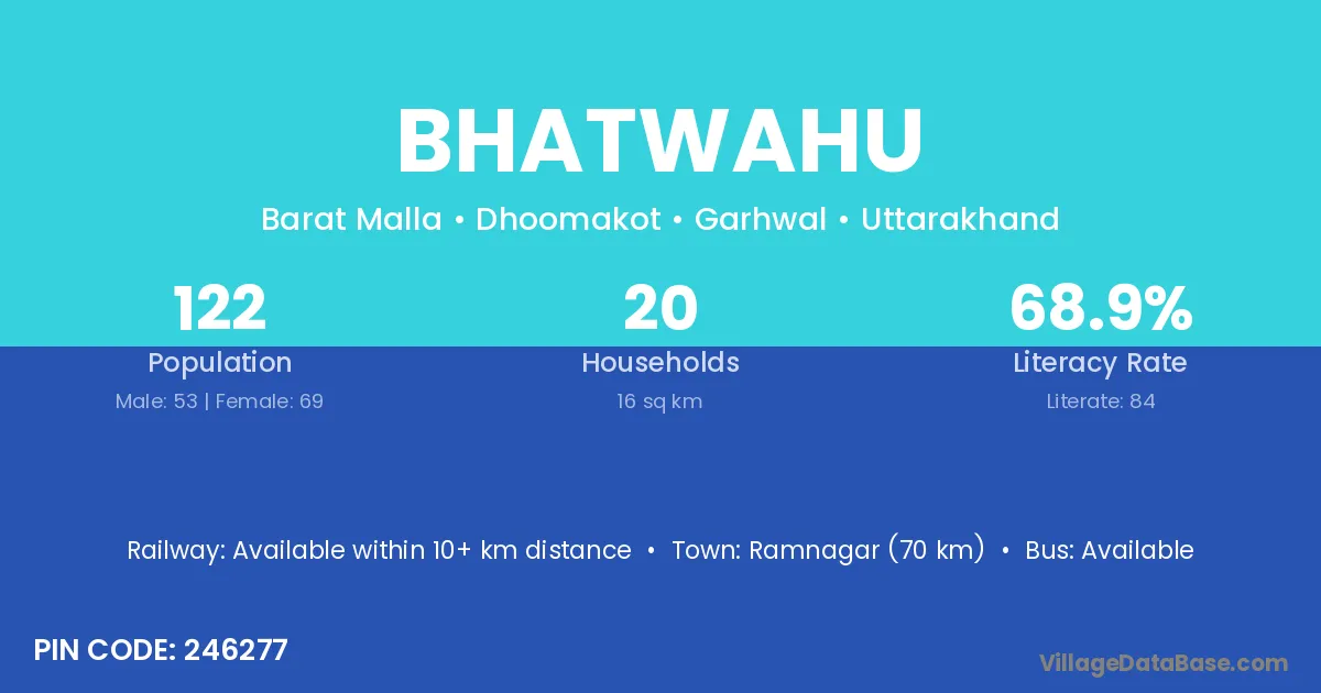 Ramnagar (70 km) is the nearest town to Bhatwahu village for major economic activities and is located approximately 70 km away.