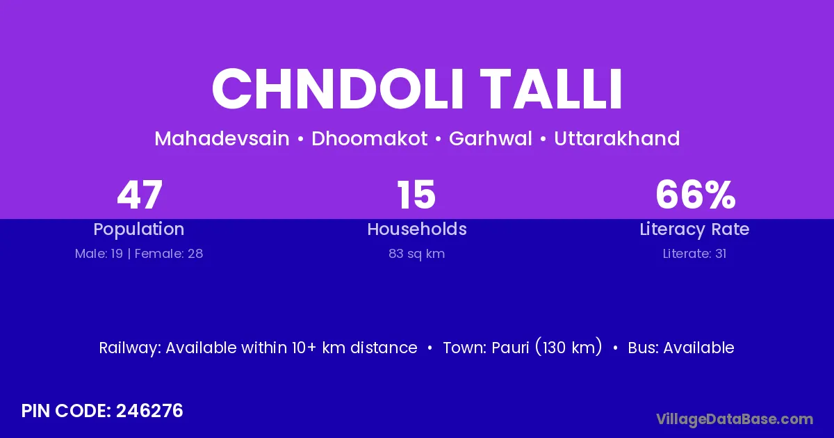 Pauri (130 km) is the nearest town to Chndoli Talli village for major economic activities and is located approximately 130 km away.