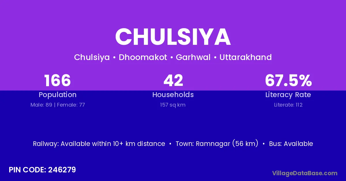 Ramnagar (56 km) is the nearest town to Chulsiya village for major economic activities and is located approximately 56 km away.