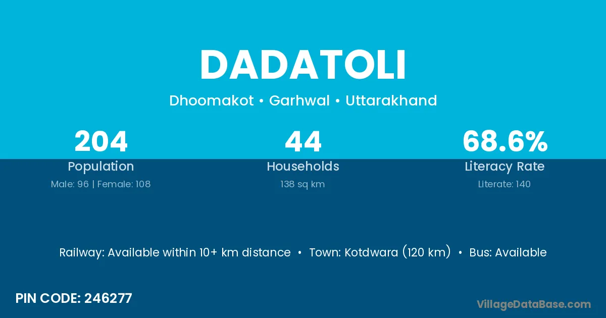 Kotdwara (120 km) is the nearest town to Dadatoli village for major economic activities and is located approximately 120 km away.