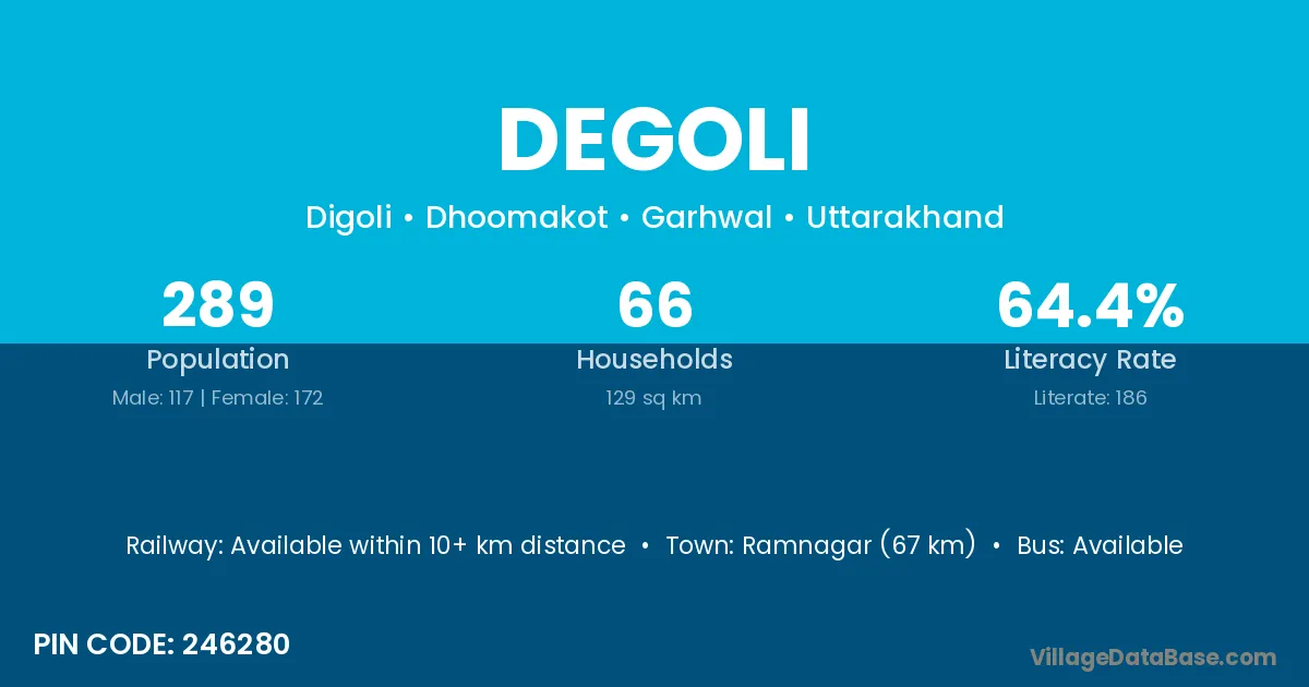 Ramnagar (67 km) is the nearest town to Degoli village for major economic activities and is located approximately 67 km away.
