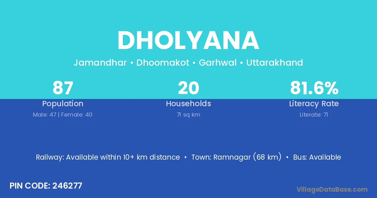 Ramnagar (68 km) is the nearest town to Dholyana village for major economic activities and is located approximately 68 km away.