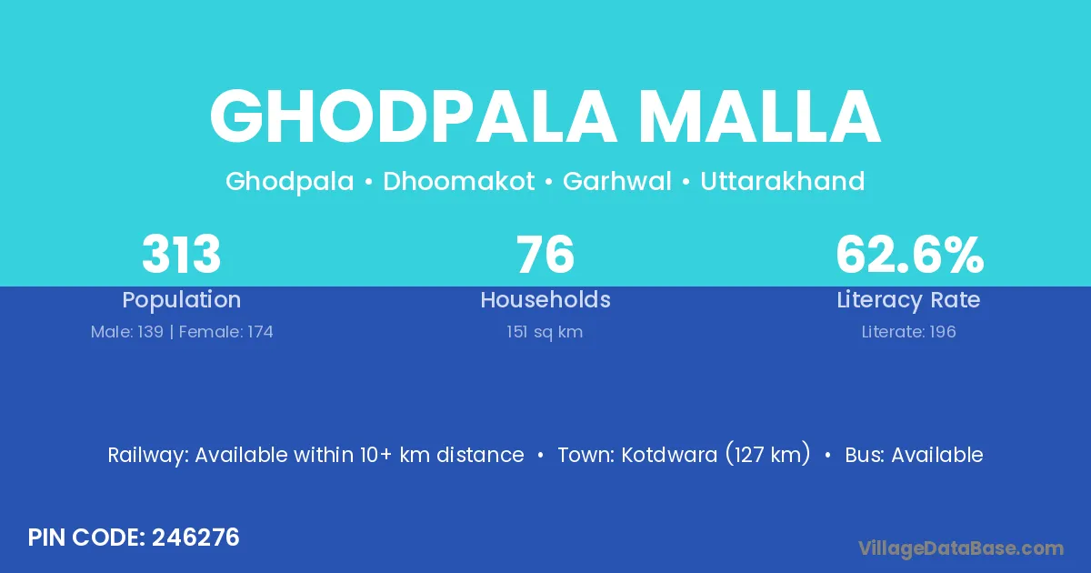 Kotdwara (127 km) is the nearest town to Ghodpala Malla village for major economic activities and is located approximately 127 km away.